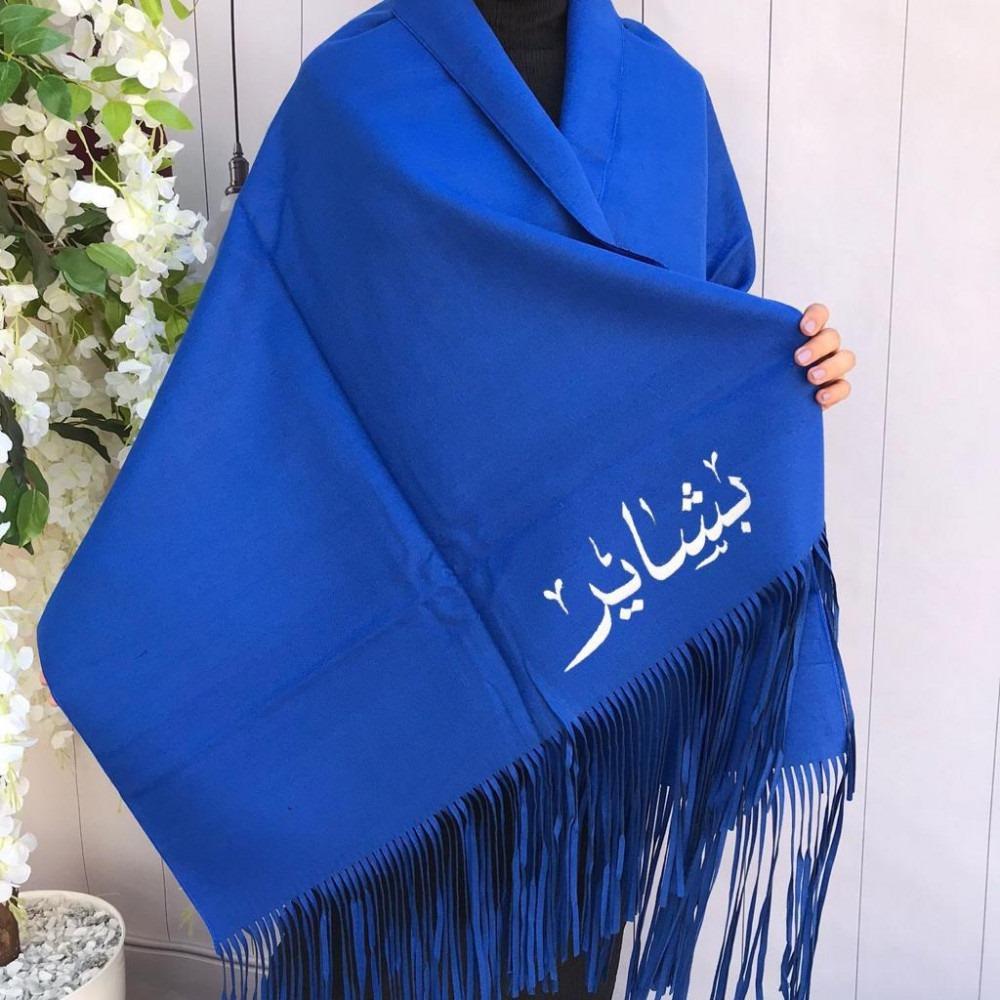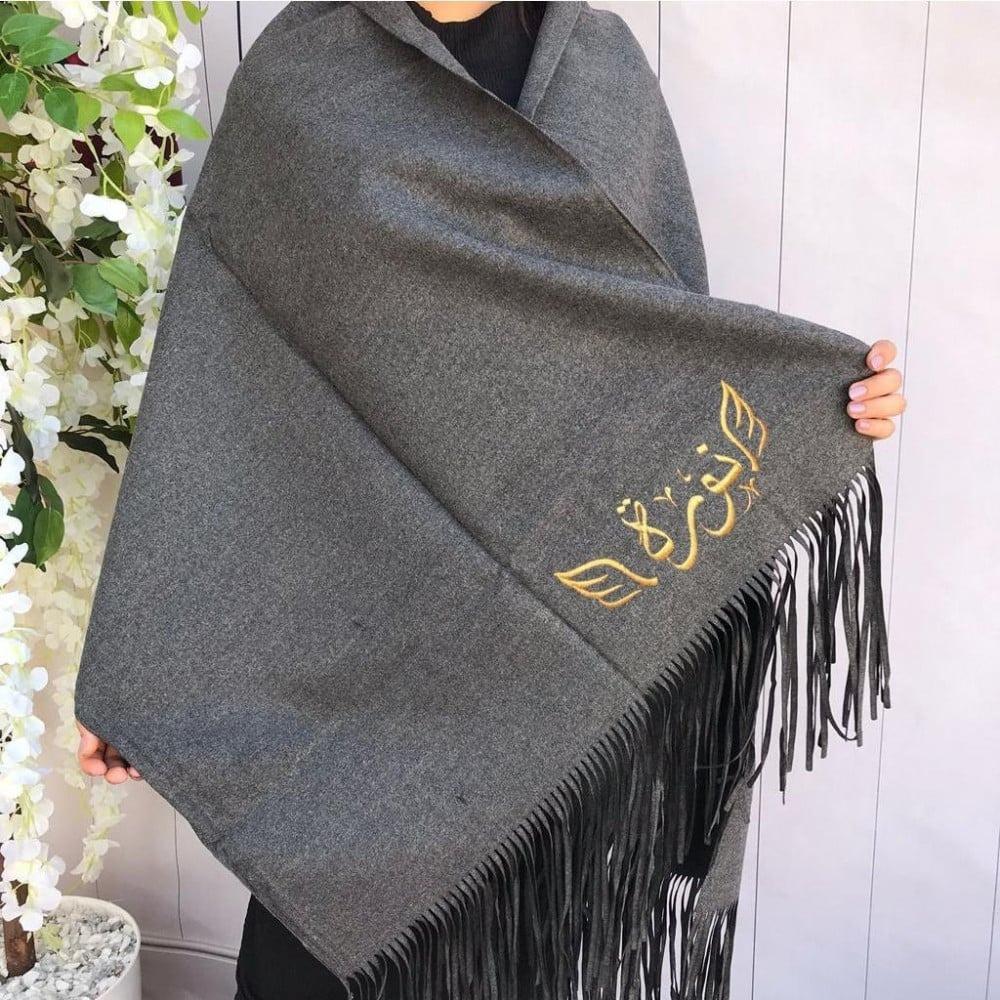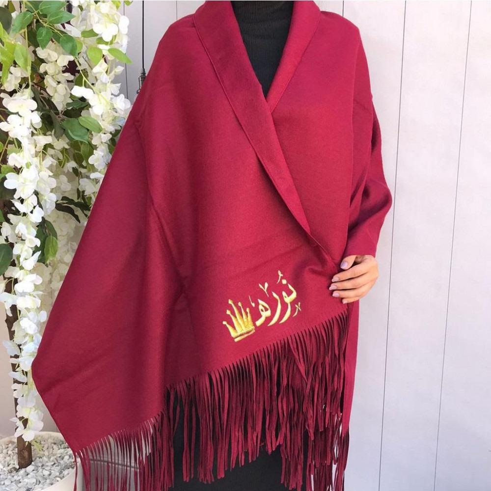 - تعبير شخصي: يمكنك تخصيص هذا الشال باسمك أو اسم من تحب، ليكون قطعة لا تُنسى.