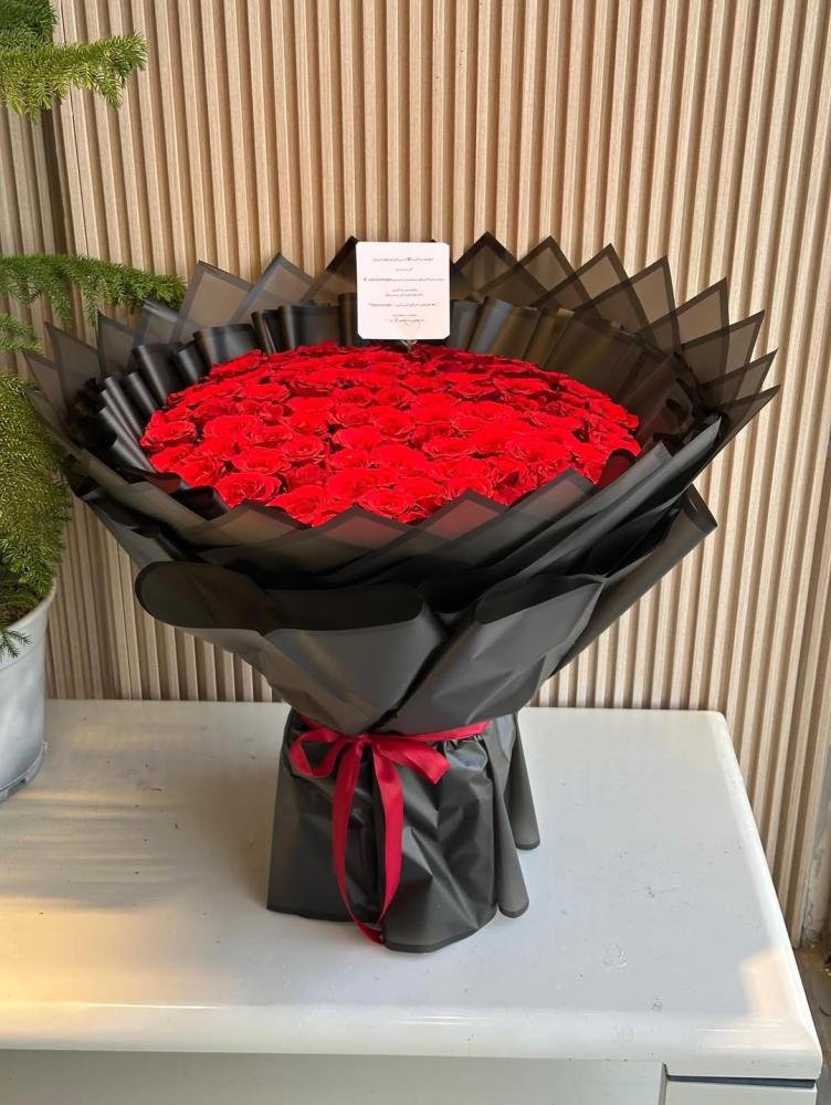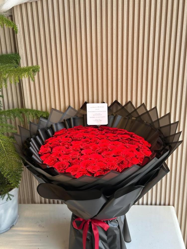 هذه الباقة هي تجسيد كلاسيكي للحب والعشق، حيث تضم حوالي 100وردة حمراء ذات بتلات مخملية غنية.